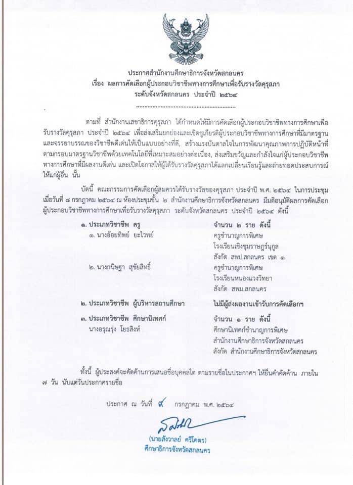 ประกาศสำนักงานศึกษาธิการจังหวัดสกลนคร เรื่อง ผลการคัดเลือกผู้ประกอบวิชาชีพทางการศึกษาเพื่อรับรางวัลคุรุสภา ระดับจังหวัดสกลนตร ประจำปี ๒๕๖๔